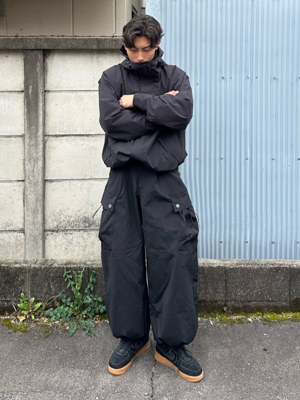 黒のテックジャケットに、圧倒的なボリューム感のある黒のワイドカーゴパンツを合わせたオールブラックコーデ。 裾が絞られたバルーンシルエットのカーゴパンツが、コーデの個性的な印象を高めています。上下を黒で統一しつつ、シルエットに極端な緩急をつけることで、ストリート感の強い洗練された着こなしに仕上げています。