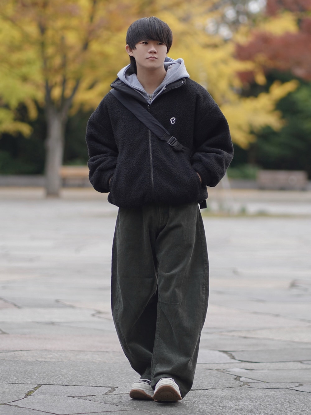 黒のボアブルゾンにグレーのパーカーを重ね,太めのコーデュロイパンツを合わせた冬のカジュアルコーデ。 ボリューム感のある上半身に対してワイドなボトムスを選ぶことで、ルーズなシルエットを演出しています。 全体をダークトーンで落ち着かせつつ、首元や足元に明るめの色を取り入れることで、軽快な印象に仕上げています。