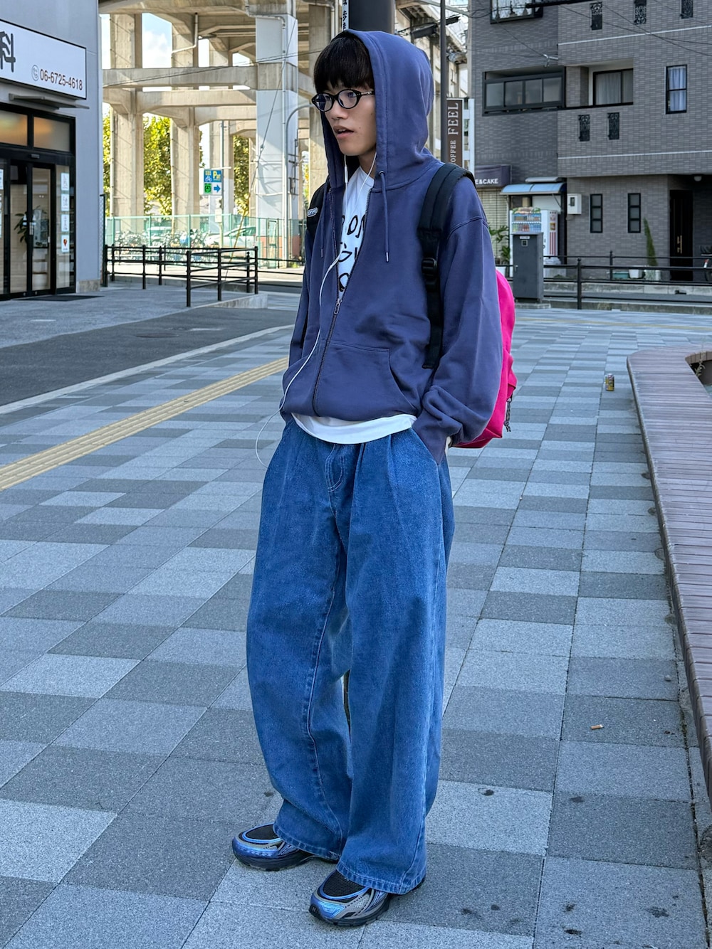 ネイビーのジップパーカーに、ブルーのワイドデニムを合わせた王道ストリートスタイル。 足元にボリュームが溜まるルーズなシルエットのデニムが、コーディネート全体に今っぽいリラックス感を演出。 上下のトーンを変えたブルーのグラデーションに、ピンクのバックパックが遊び心のある差し色になっています。