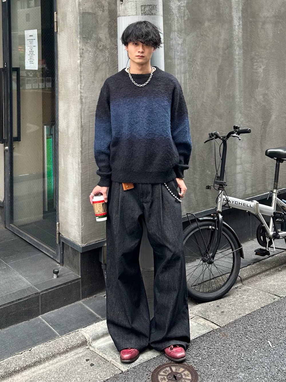 ネイビー×黒のニットに、重厚感のあるワイドデニムを合わせたコーデ。深みのある配色でカジュアルながら落ち着いた雰囲気を感じさせる着こなしです。シルバーネックレスをアクセントにして、ニットの柔らかい質感にシャープな印象をプラスしています。