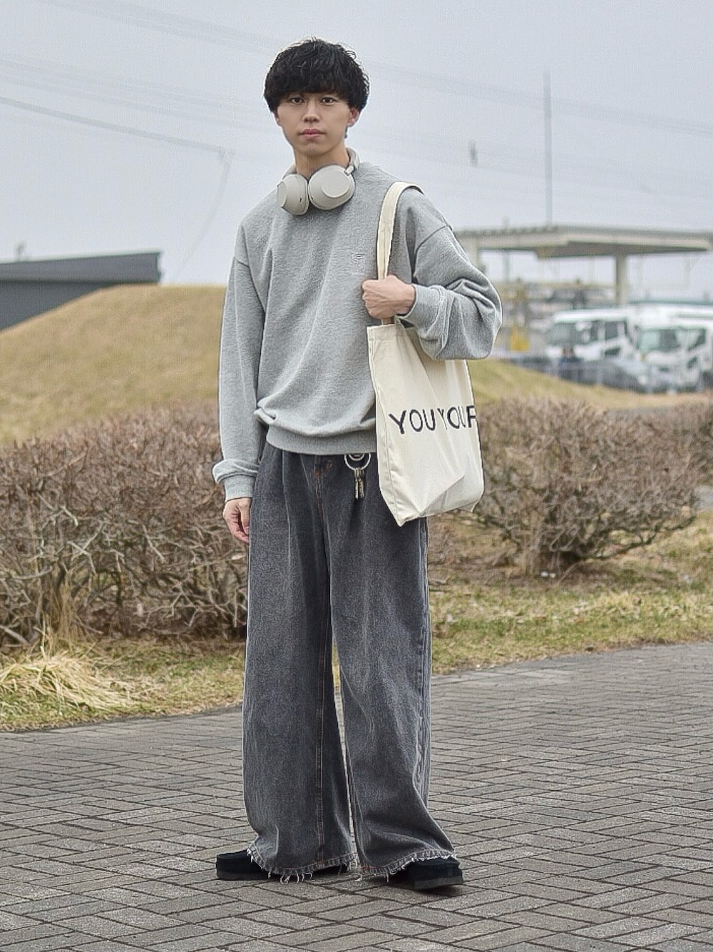 グレーのスウェットに、裾のカットオフが特徴的なワイドデニムを合わせたリラックスコーデ。 全体をグレーのワントーンでまとめて、統一感のあるスタイルに仕上げています。 首元のヘッドホンやロゴ入りのトートバッグが、シンプルな着こなしに程よいアクセントをプラス。