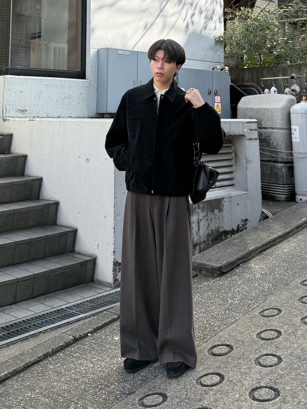 黒のブルゾンに、深みのあるブラウンのワイドスラックスを合わせたコーデです。足元に溜まるほどボリュームのあるワイドシルエットが、今っぽいリラックス感とモードな表情を演出。短め丈のブルゾンで腰位置を高く見せることで、太めのスラックスでも重たくなりすぎずスタイル良く見せています。