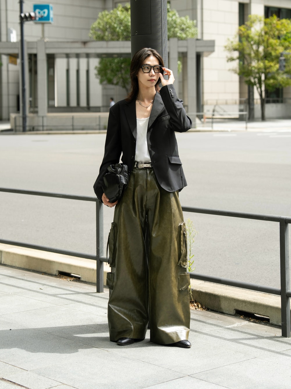 黒のテーラードジャケットに、カーキのワイドカーゴパンツを合わせたコーデ。 ドレッシーなジャケットと無骨なカーゴパンツを組み合わせることで、メリハリのあるモダンな着こなしに。 シルバーのアクセサリーや白のベルトをアクセントにして、洗練されたモードな雰囲気を演出しています。