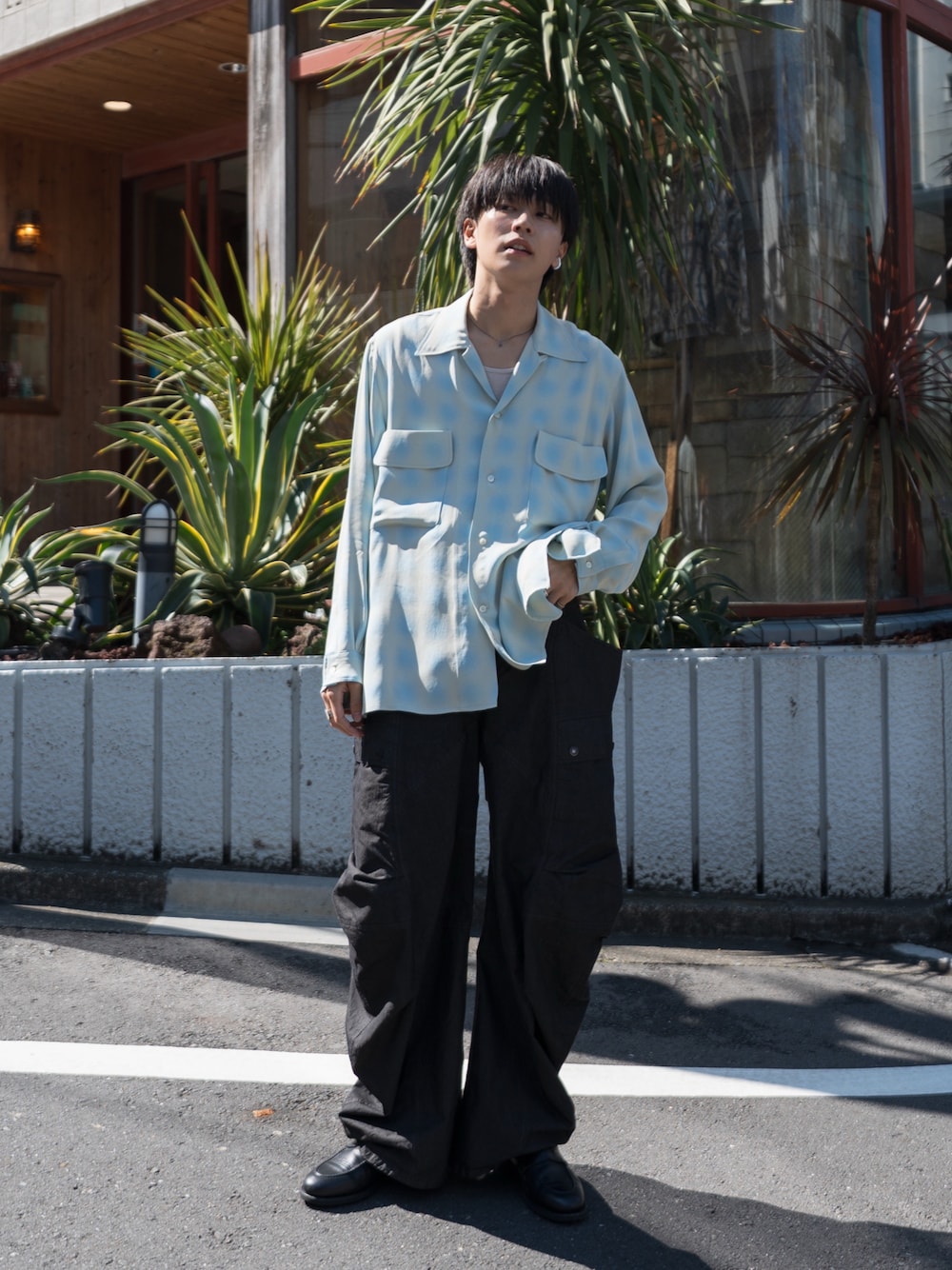 淡いブルーのオンブレチェックシャツに、ワイドシルエットの黒カーゴパンツと黒の革靴を合わせたコーデ。 カジュアルで無骨な印象のカーゴパンツに、あえてドレッシーな革靴を合わせることで、洗練された大人のミックススタイルが完成しています。