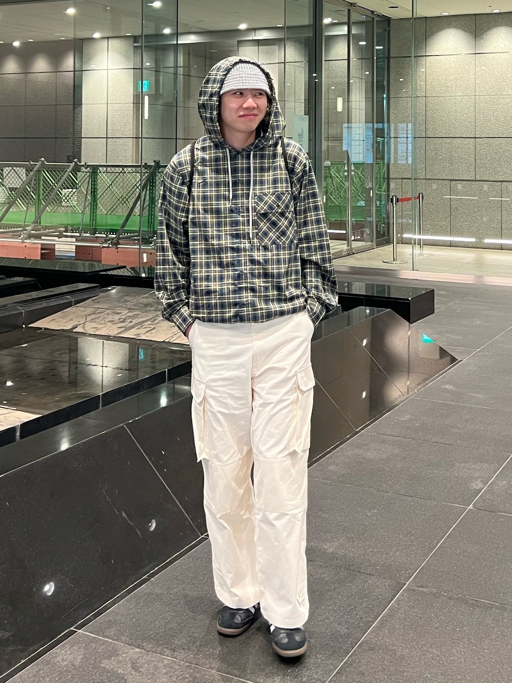 チェック柄のシャツパーカーに、ワイドな白のカーゴパンツを合わせたカジュアルコーデ。 パターンのあるトップスとボリュームのある白パンツの組み合わせが、個性的かつ清潔感のあるスタイルを確立しています。ビーニーを忍ばせたフードのレイヤードで、顔まわりにアクセントをプラスしています。