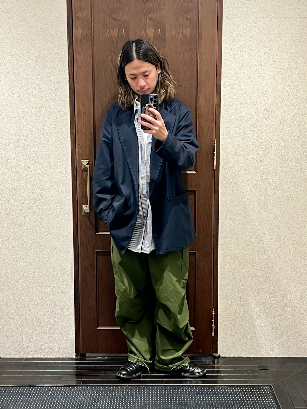 ネイビーのジャケットにストライプシャツ、ボリュームのあるオリーブのカーゴパンツを合わせたコーディネート。 カジュアルなカーゴパンツをあえて品のあるジャケットで引き締めることで、落ち着いた大人カジュアルに昇華させています。 足元には光沢のある革靴を合わせることで清潔感と高級感をプラス。