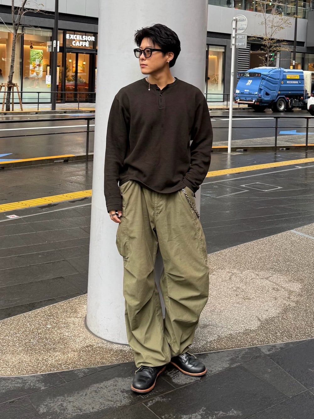 黒のヘンリーネックカットソーに、カーキのワイドカーゴパンツを合わせたコーデです。 アクセサリーや眼鏡などの小物使いが、シンプルな組み合わせに洗練されたエッセンスを添えています。革靴合わせで大人っぽくまとめています。