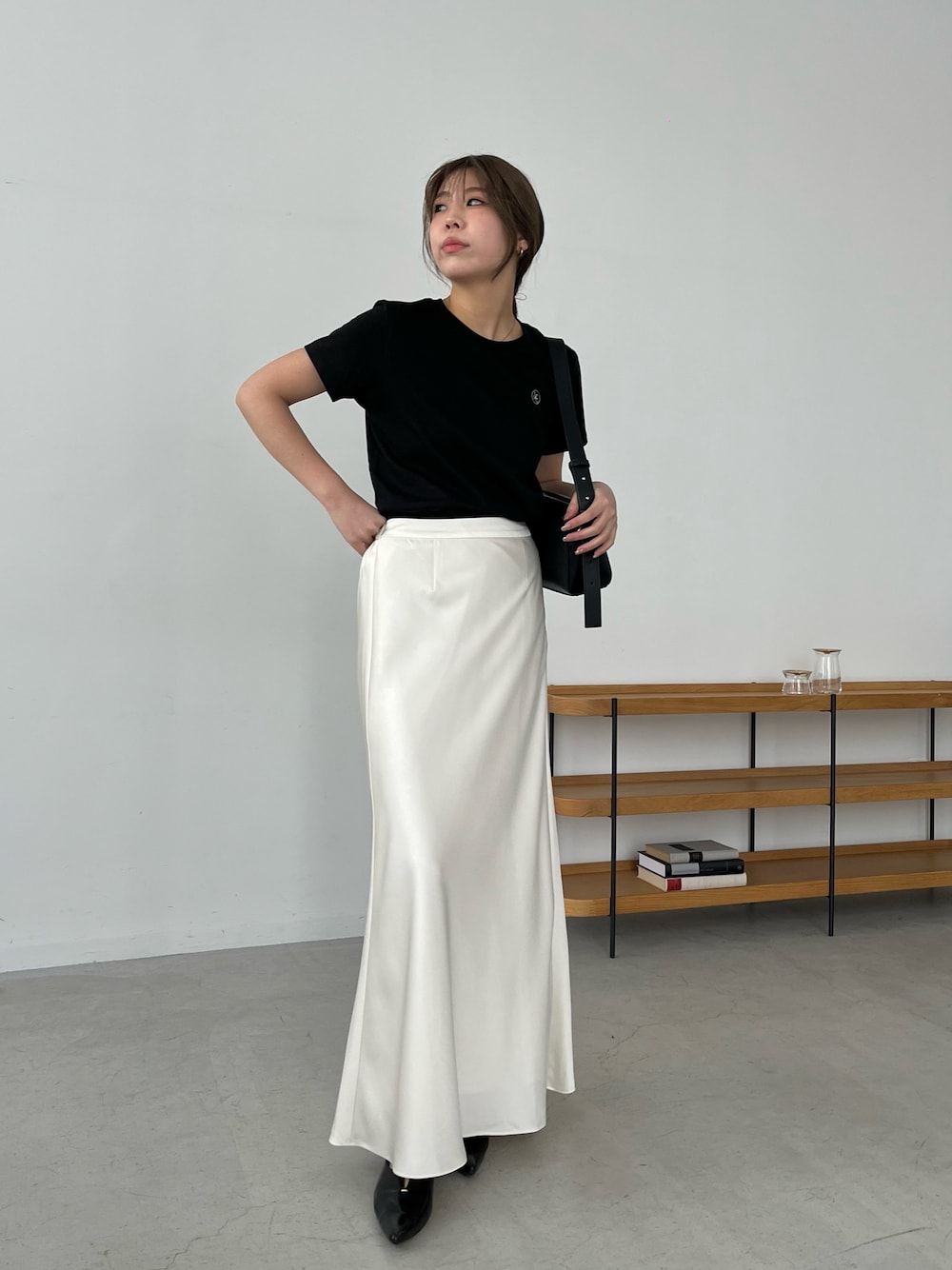 黒のコンパクトなTシャツに、光沢感のある白のロングスカートを合わせたモノトーンコーデ。ハリのある素材のTシャツに、広がりすぎない縦のラインを強調するスカートを合わせることで、骨格ストレートさん特有の上半身の厚みをすっきり見せています。
