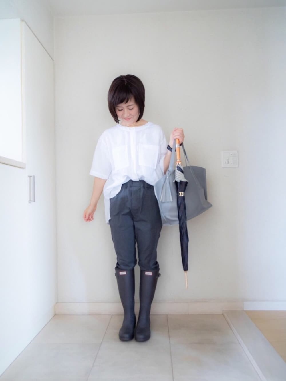 通勤コーデ♪ 大雨の日。 濡れてもシワが気にならないリネンのブラウスにグレーパンツをあわせてみました^ ^ 見てくださりありがとうございます(^^)