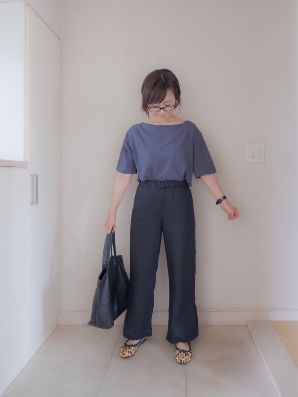 通勤コーデ♪ ネイビーtee×リネンパンツ 同系色の組み合わせ。 ヒョウ柄のバレエシューズをポイントに。 見てくださりありがとうございます^ ^