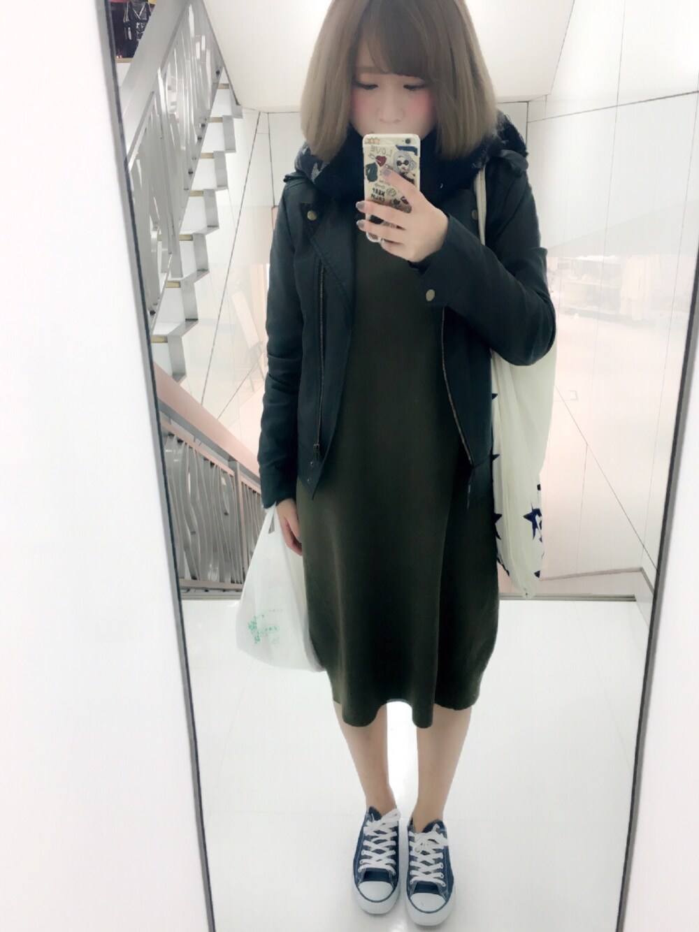 コンビニの袋片手にお久しぶりの投稿です♡ ニットワンピースにライダースのMIXコーデ♡