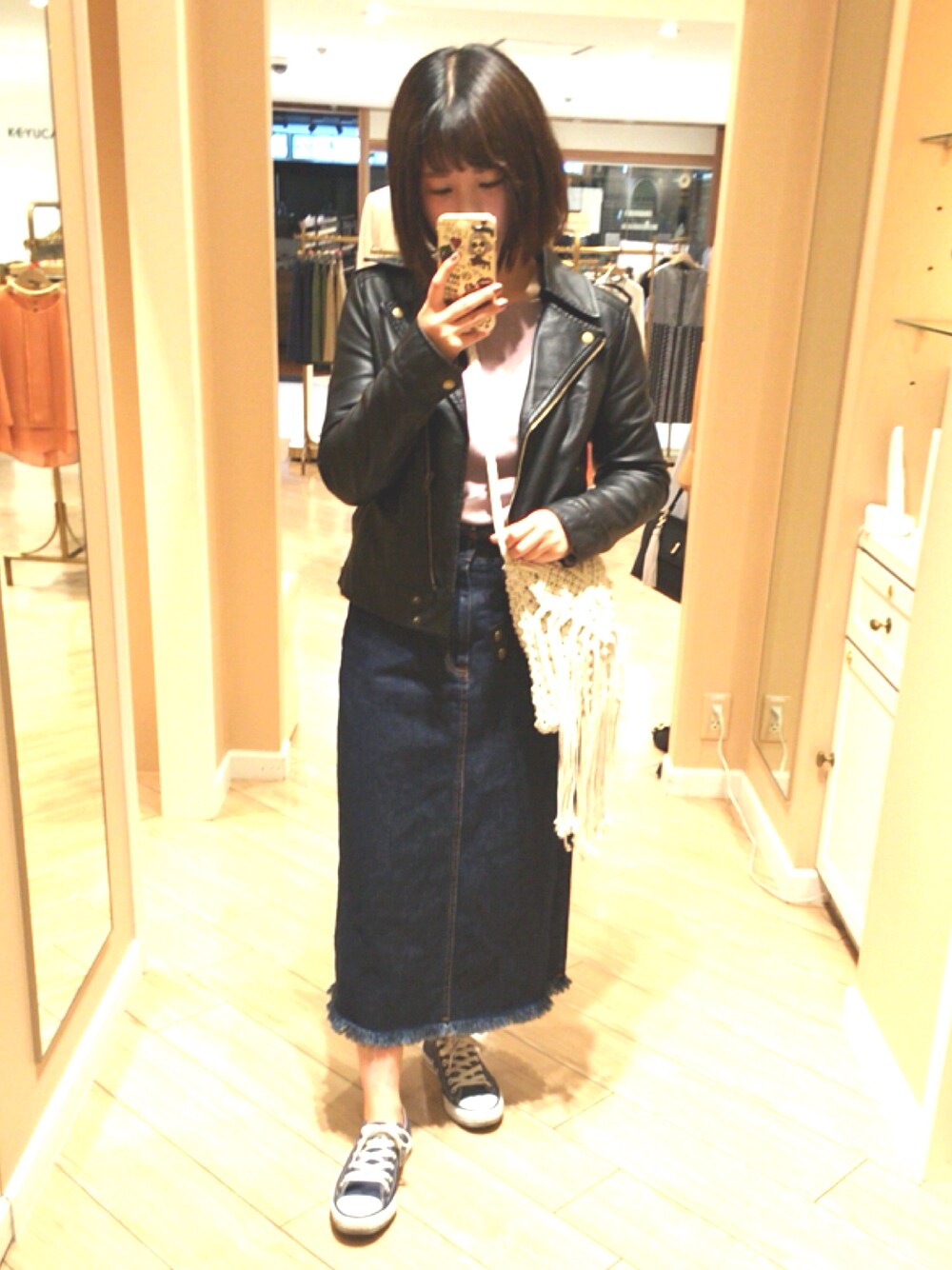 デニムスカートにピンクのニット♡ バックお気に入り♡