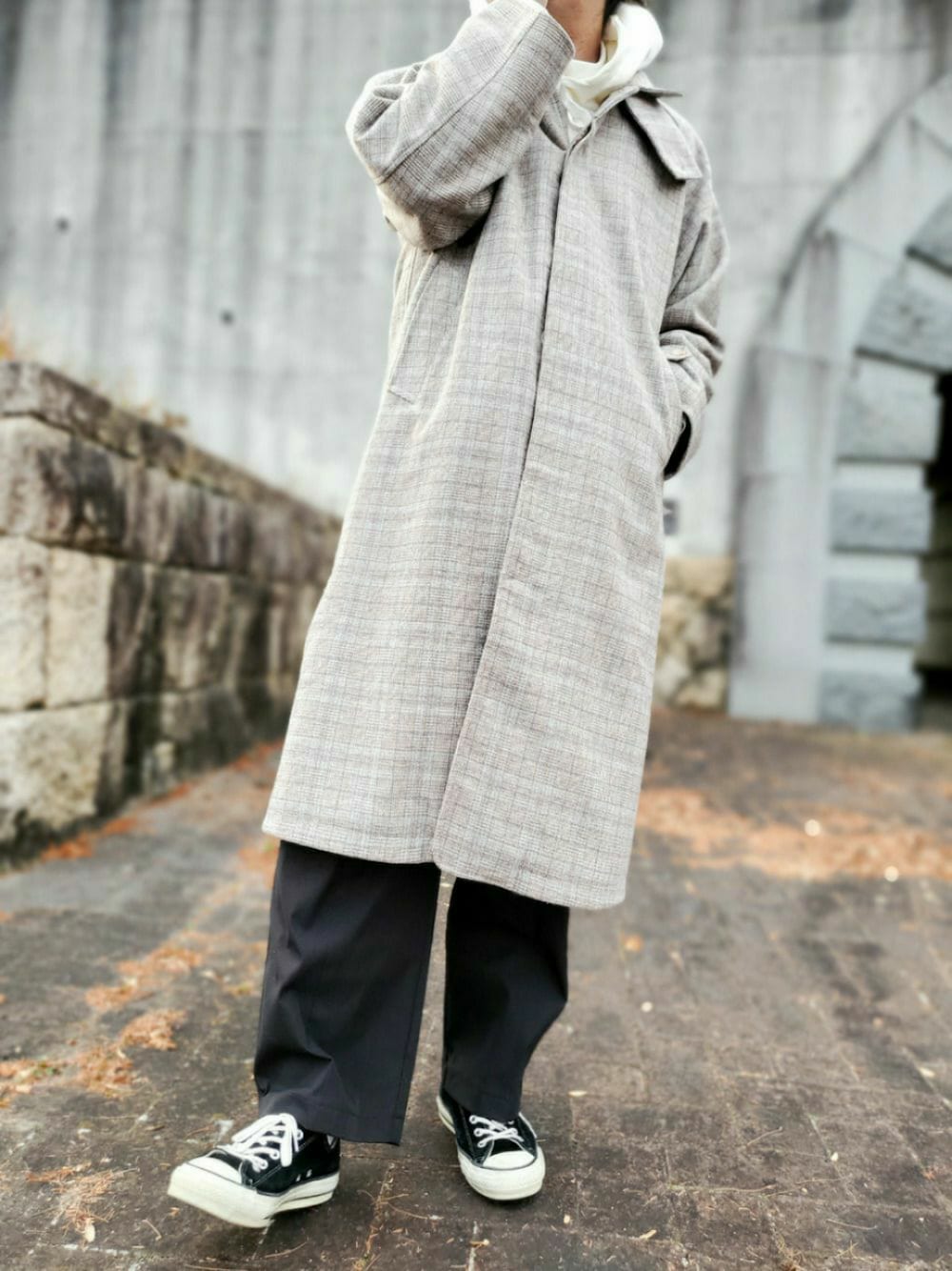 ARu.のステンカラーコート「オーバーサイズ メルトン チェック柄ステンカラーコート」を使ったコーディネート