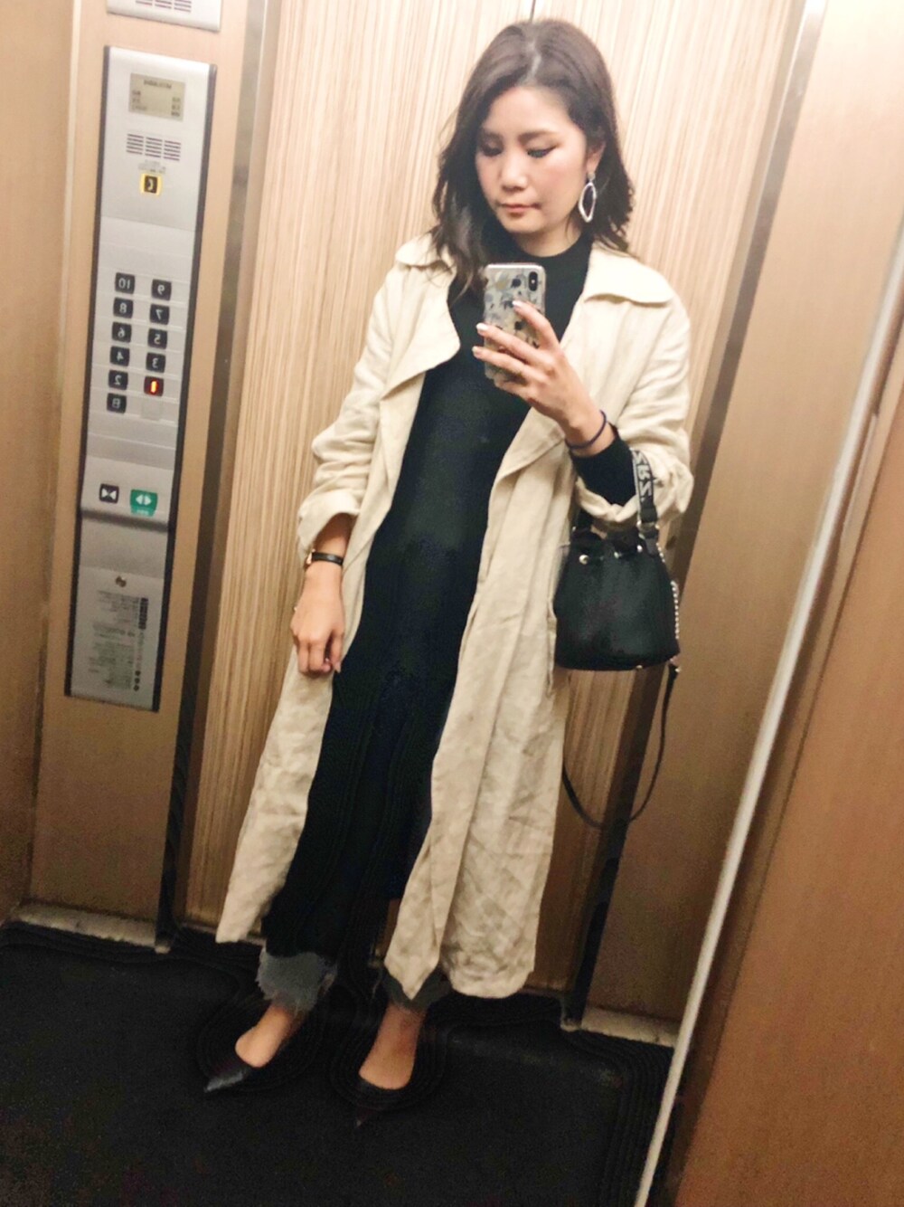 ブラック系のワンピース、ベージュ系のトレンチコートを着用したレディースの春コーディネートの1枚目の写真