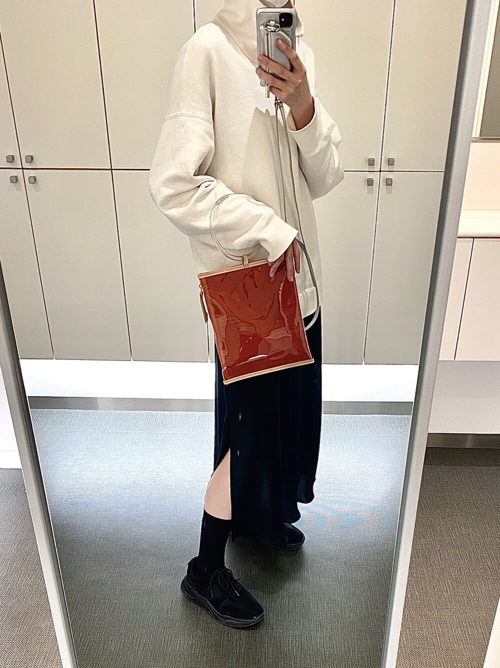 サテンのキャミドレスにスエットを重ね着。 PVCのバッグ、気分あがる💥💥