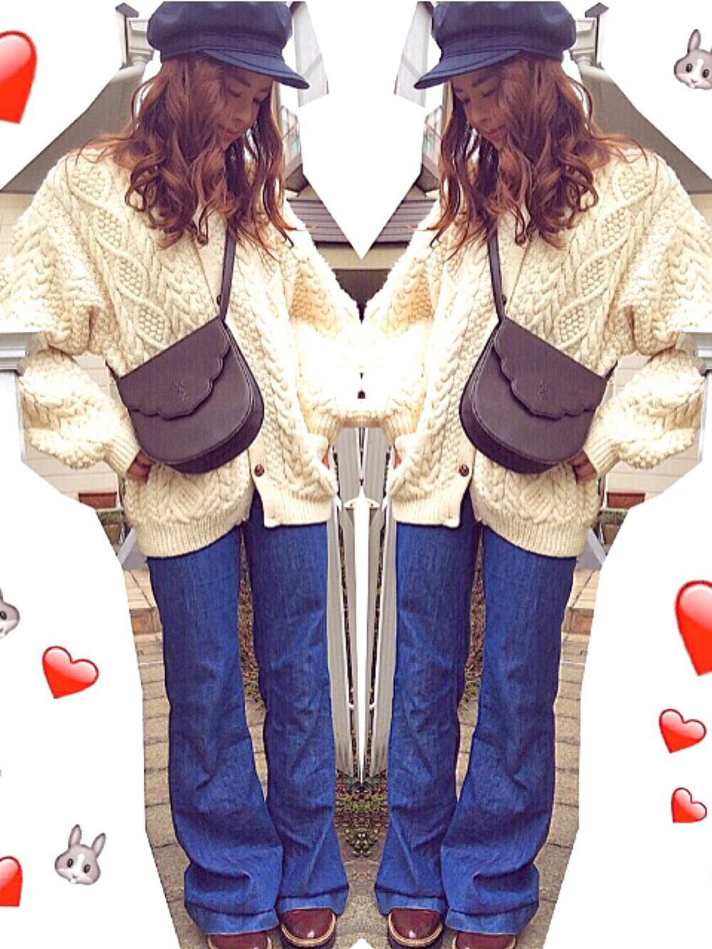 ~🐰 お母さんが昔防寒用に着てたニットを着てみたら意外とすごくかわいくて、主役にコーデ組んでみました 🌼💕🌼💕🌼このダボっと感がほんとに絶妙で古着ならではですね❕💐♡マリン帽とバギーを合わせてさらにヴィンテージ感アップ 👌🏻👌🏻💗💗💕💫
