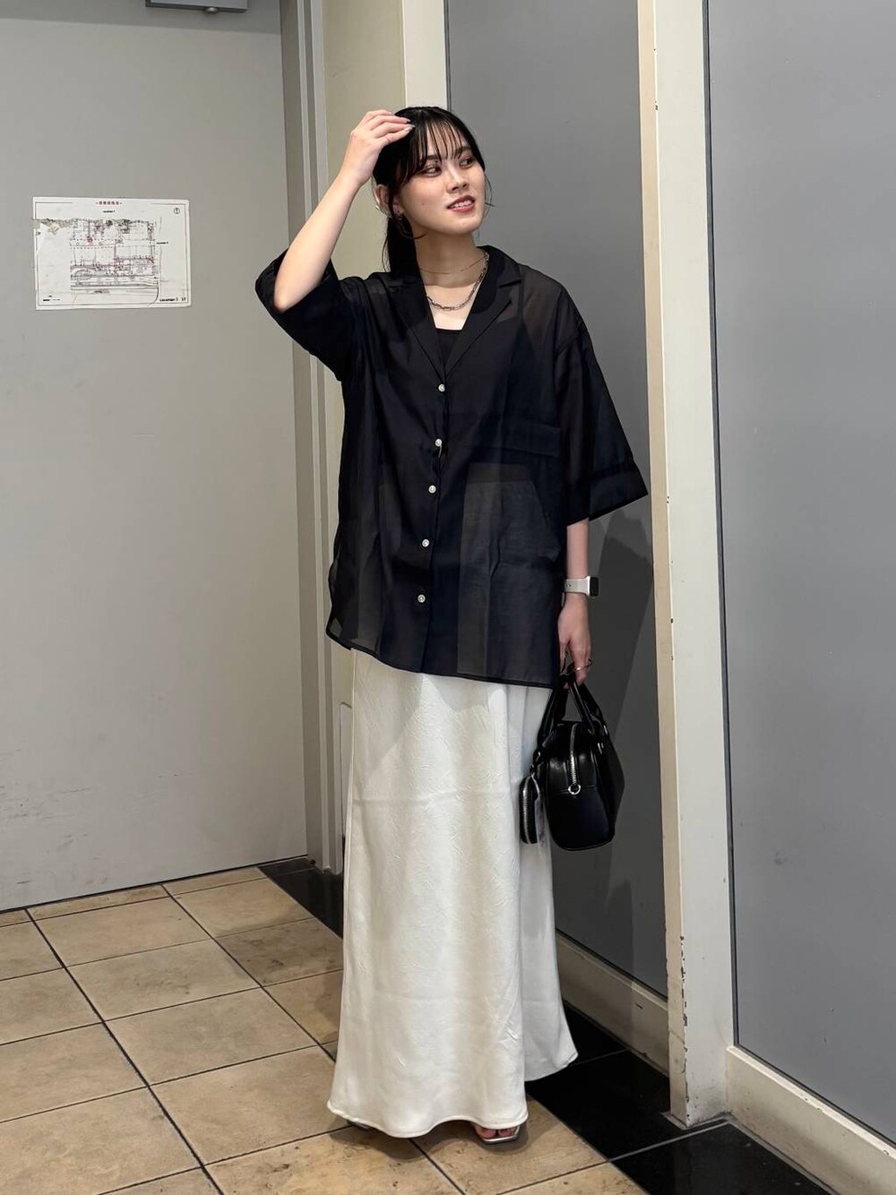 シンプル大人コーデ♡ 程よい透け感の開襟シャツ➕落ち感のあるサテンスカートの合わせはシンプルだけどオシャレに着れちゃうアイテムです!!✨ 暑い日でもサラッと着れる生地感なので夏にオススメ☀️