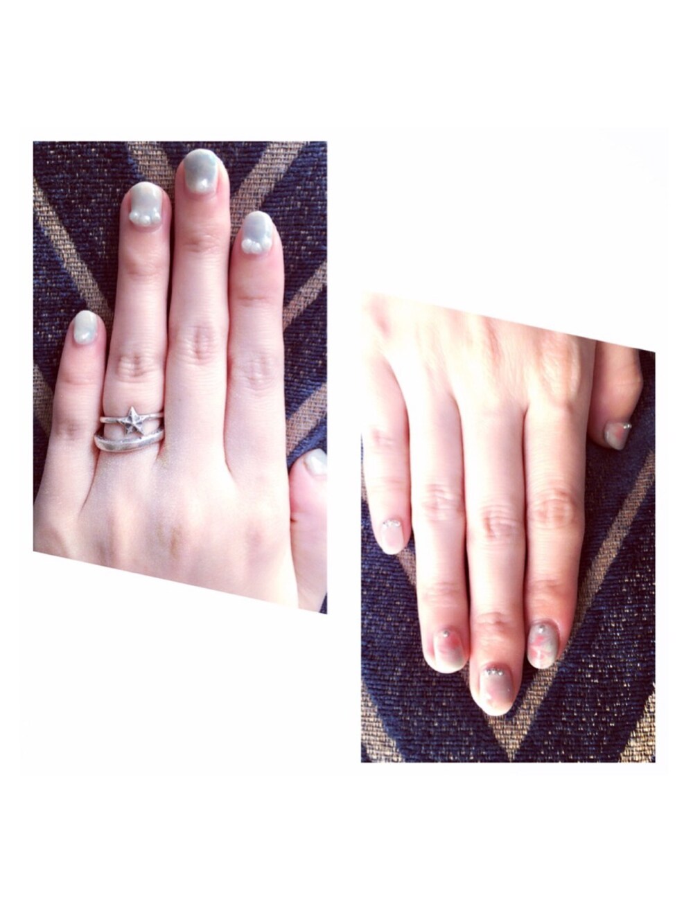 今年最後のセルフネイル! ホワイト、グレーベースのマーブル。 左はブルーでパール 右はオレンジにシルバースタッズ。 簡単♡