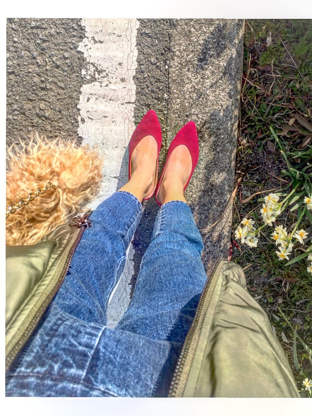 ブルー系のデニムパンツを着用したレディースの春コーディネートの1枚目の写真