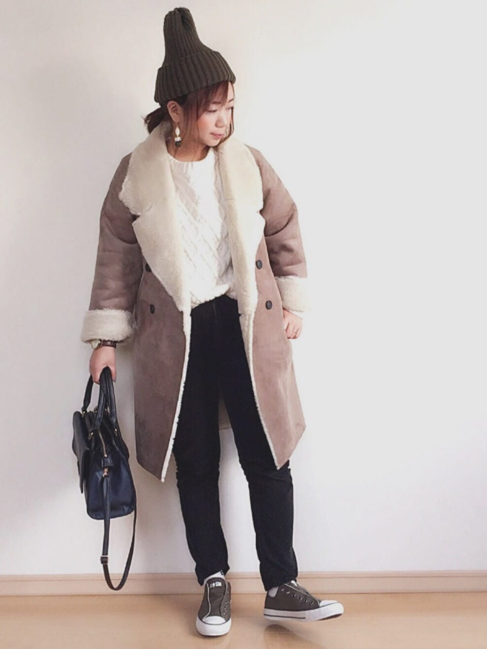 ムートンコートの暖かさすごい💛 紐なしコンバース楽チンで履きやすいです✨