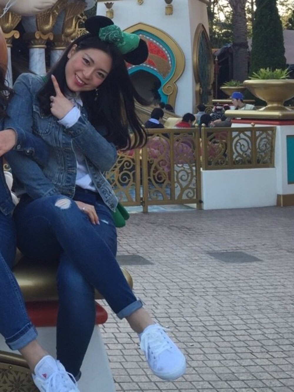 TDSに親友と行ってきました💓 デニムonデニムと白シャツ、白スニーカーのお揃いコーデ!緑のショルダーバッグに合わせてミニーのミミを緑のバンダナをかぶせてリメイクしました💓