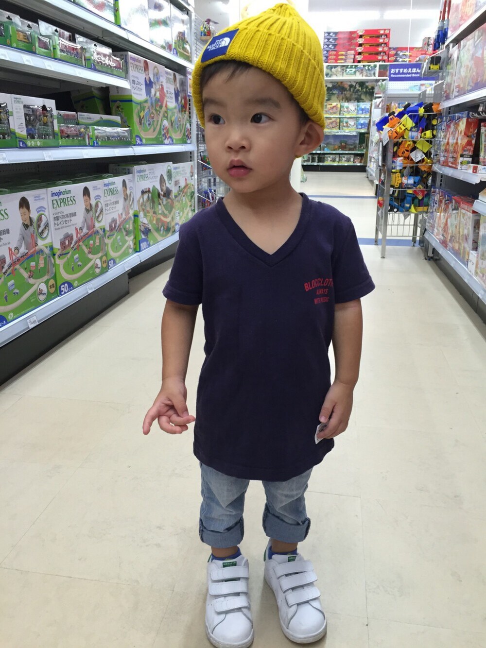 今日は朝から雨だったので近くのイオンにお出かけ! まだまだ蒸し暑いので上はこの夏1番お気に入りだったBlockのvネックtシャツ✨ かなり来たおした感がありますがまだまだ現役!! サイズは100なので少し大きめっですがこのゆった り感が案外お気に入りです笑 下は最近お気に入りのライトオンキッズのデニムパンツ!生地も硬くなく履きやすいと思います。 2枚で3000円だったので色違いも同時購入しました。 ニット帽はまさに今日は購入したばかりのノースフェイスの帽子です!からし色が欲しくて一目惚れしました。