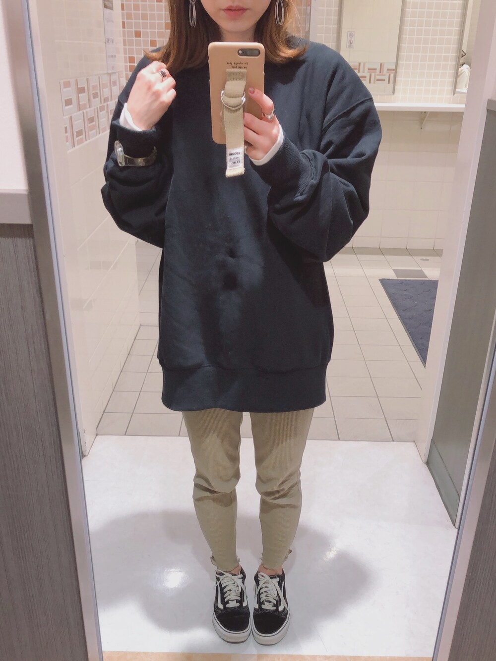 ブラック系のスウェット、ブラック系のスニーカー、グリーン系のレギンス/スパッツを着用したレディースの冬コーディネートの1枚目の写真