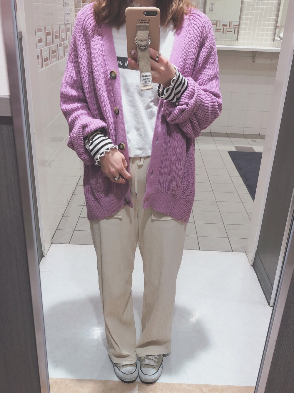 この間のリブワイドパンツを着まわし◡̈⃝︎ カーデの下はカジュアル派✪ ロゴT早く一枚で着たいなぁー。