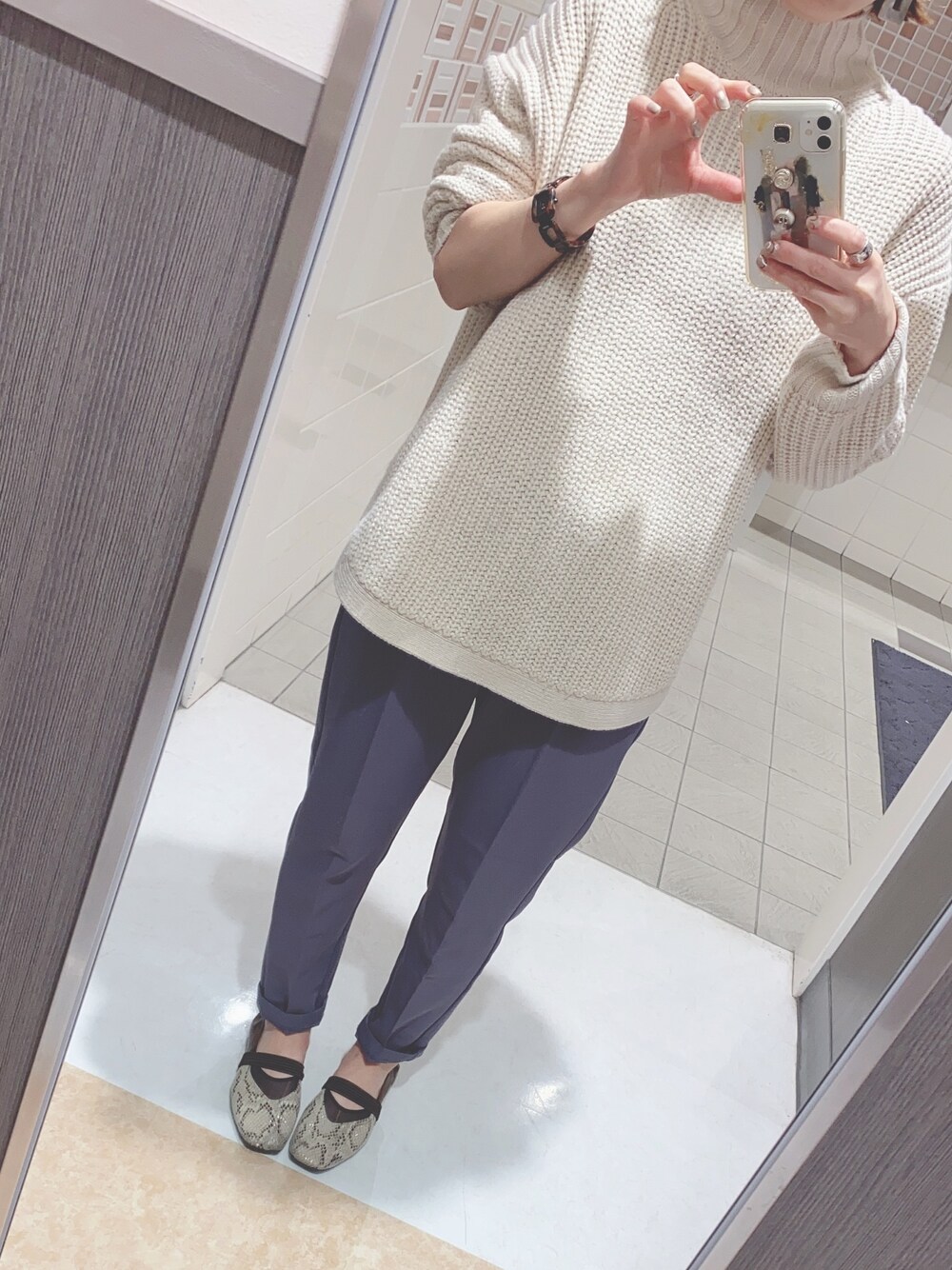 ホワイト系のニット/セーター、ブルー系のパンツ、ブラウン系のシューズを着用したレディースの秋コーディネートの1枚目の写真