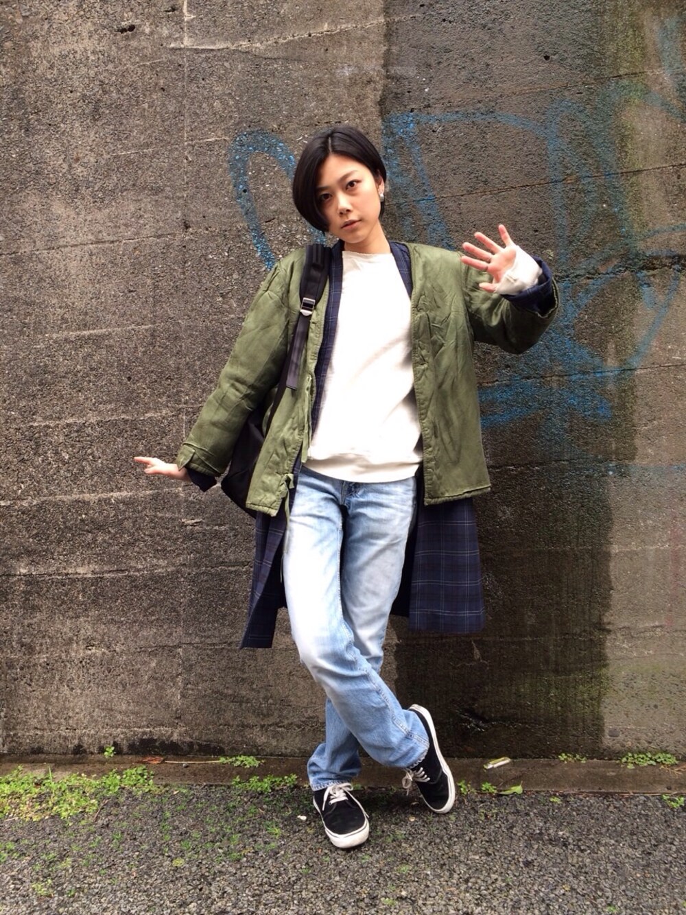 ミリタリーアウターとチェックシャツのガウンを合わせました☺︎ ミリタリージャケットはノーカラーでちゃんちゃんこみたいな仕様です◎ 本日もまた、usedばかり。