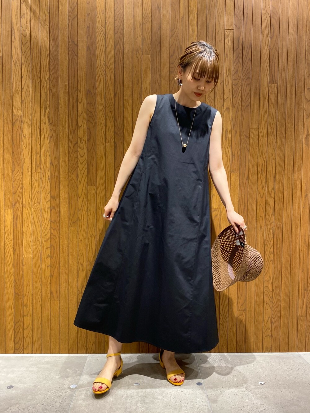 Aラインがかわいいワンピースは楽ちんなのに1枚で様になる優れもの◎ 足元はカラーサンダルで夏らしさをプラス。 休日のお出かけにピッタリです!