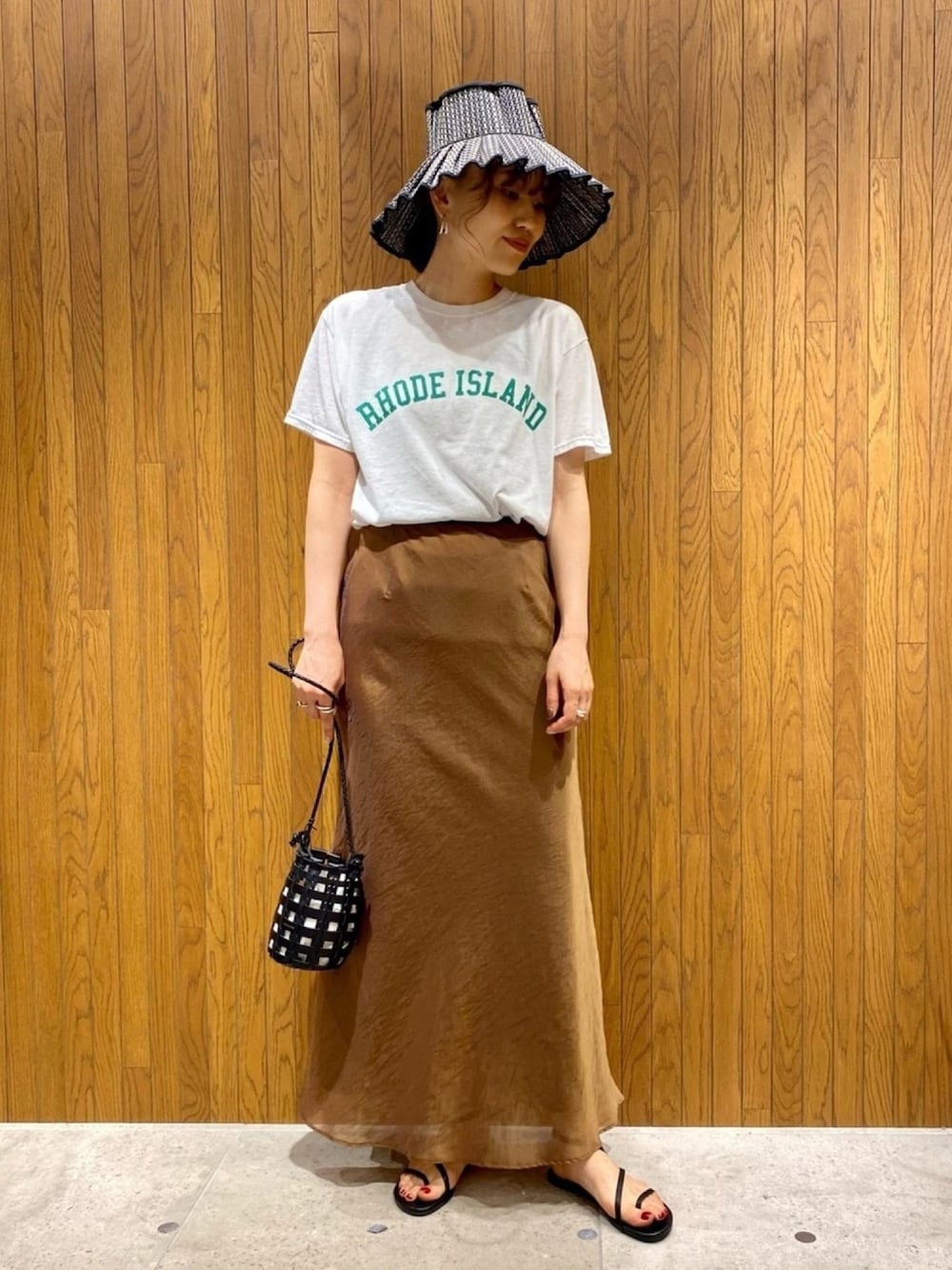 シアー素材のスカートで夏らしいカジュアルスタイルを。 雑貨を全て黒でまとめた大人カジュアルです◎