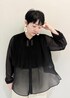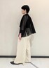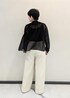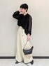 新生活を彩る通勤スタイリングです。 ブラウスは程よいシアー感と、前身頃のデザインが着やせ効果あり◎ クリーム色のワイドパンツを合わせて、ブラックコーディネートでも、柔らかい印象になるようにコーディネートしました。