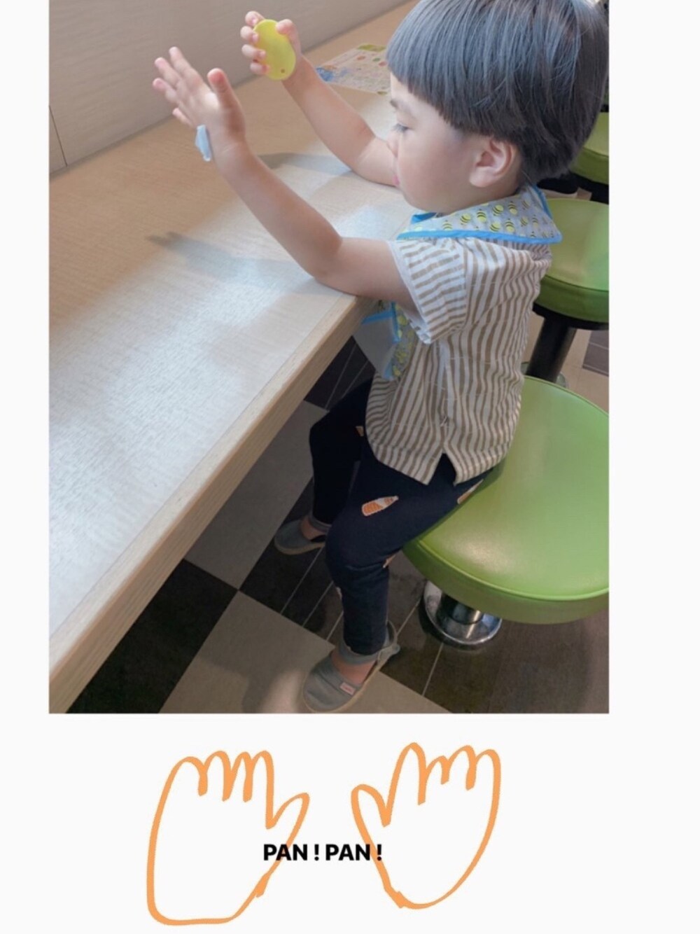結婚式にいく途中のサービスエリアで拍手の練習をしていた時の。 タイニーコットンズのソーダ柄のパンツだったのでソーダをこぼしたようなしましまトップスを合わせました。 蜂さんだらけの食事用スタイはトイザラスにあります。
