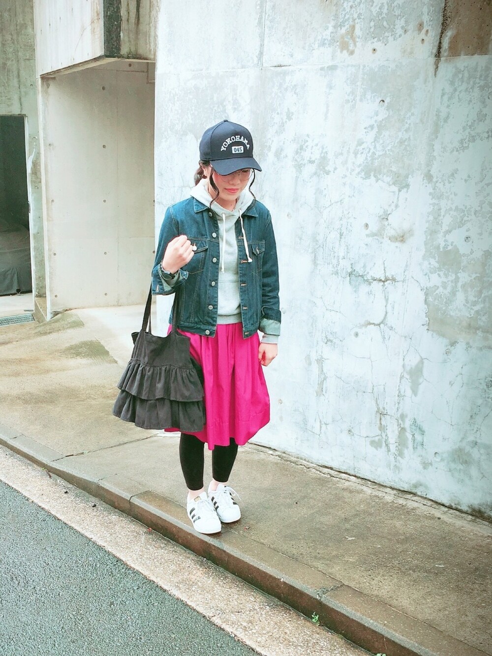 カジュアルコーデ☻✨ ピンクのスカートが主役♡レギンスとキャップでカジュアルダウン。 最近、黒髪にしました。