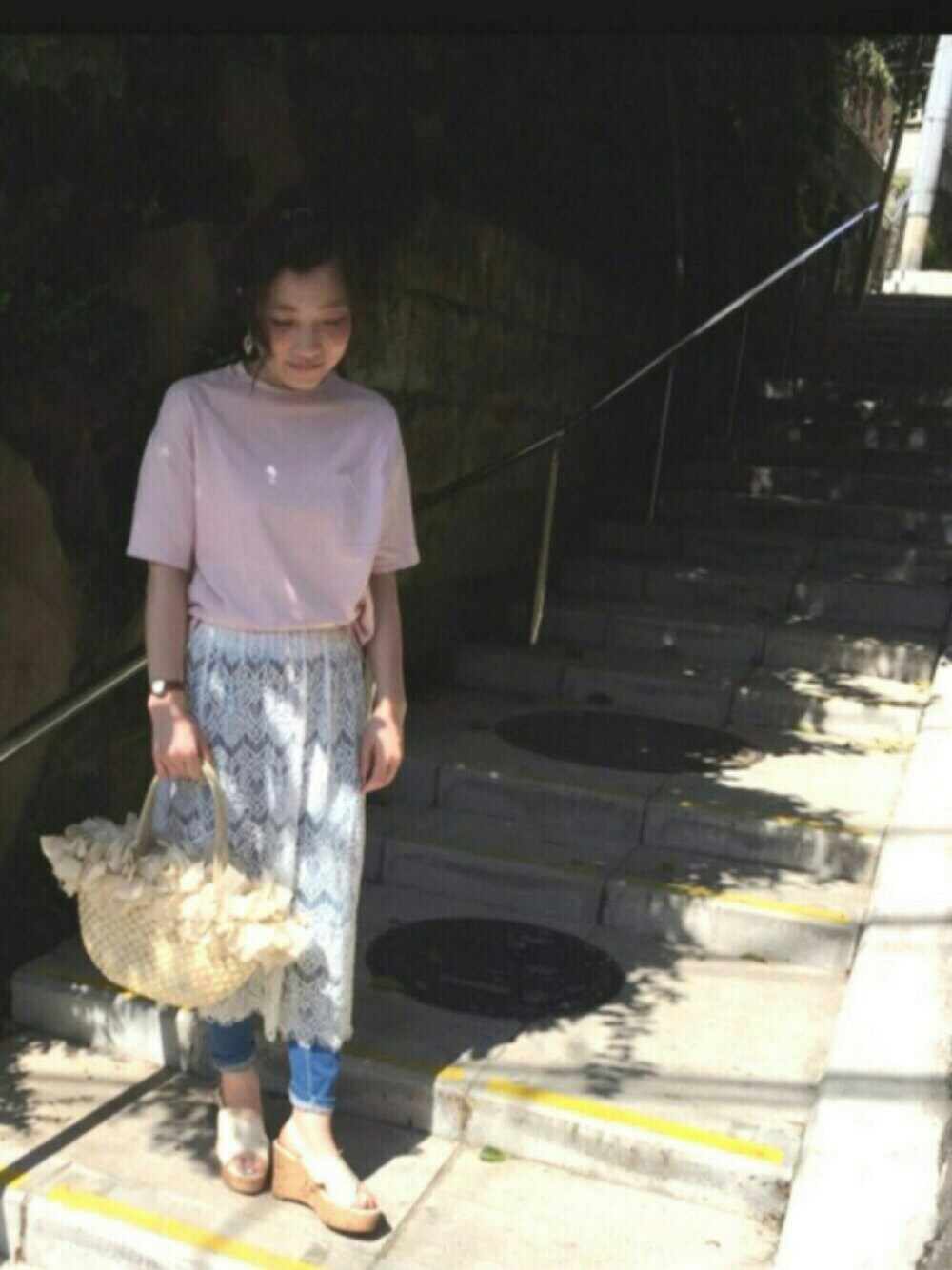夏コーデ☻✨ くすみピンクTシャツ、久々に着たけどボックス型なので、合わせやすーい♡ シンプルすぎたので、レーススカート合わせてみました♪(´ε` )❤️ サンダル、ピアスおニューです(^^)✨仲良くしてもらってる、earthmusic&ecologyブランド公認のゆみちゃんが履いていたのがかわいくてGU見に行って…即決❗️(笑) 軽くて履きやすくて、どこまででも歩けるとのこと\(^o^)/❤️🎵 確かに、軽くて歩きやすいです♪ ピアスは、夏らしいクリアでお気に入り♡ ヘアは影でなじんだけど、今日はポンパドールに、ポニーテールです。 髪色暗くて、重たく見えるからポイントにゴールドピンつけてます❗️ 顔周りに残す毛の量も大事(^^)🎵 ベースを、しっかり巻いてからだと作りやすいのでオススメ☻✨