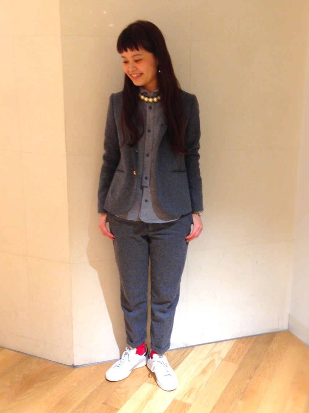 昨日に引き続きまして、 自分流Xmasコーディネート。 本日はメンズっぽく。 あえてオールグレーにして、 ソックスで赤をポイントに。 パールや、リボンなど、アクセサリーで 飾り付けしました!