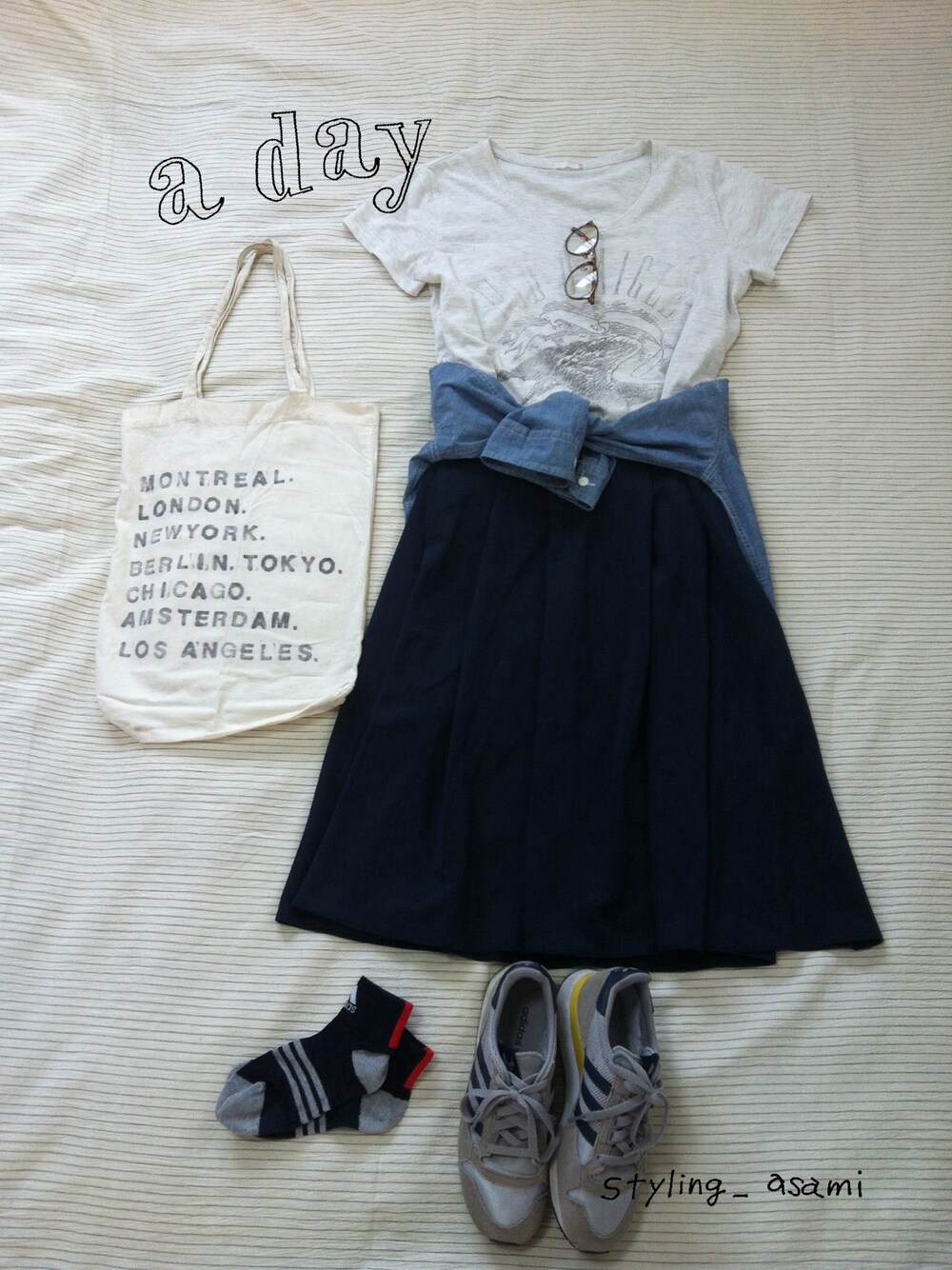 Tシャツ: GU デニムシャツ: UNIQLO 靴下: adidas エコバッグ: 無印良品(自分でつくるやつ) ハイウエストのスカートじゃないですけど、トップスインして腰位置高くするのは定番ですよね☺︎ このスカートもSALEで秋まで見越してのお買い物です。 ネイビーばっかり買ってるなぁ…。