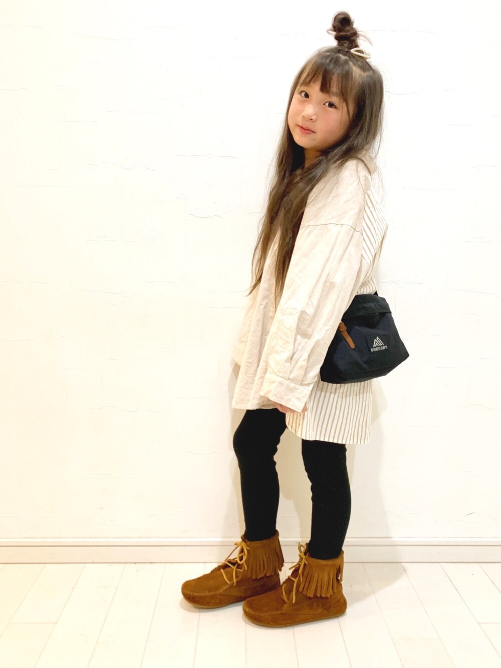 やっぱり このシャツの色味とサイズ感が 好きーーー♡ ブーツ久々に 履いた♪ tops 130着用 leggings 130着用 (123cm/24kg) 見ていただき ありがとうございます✨