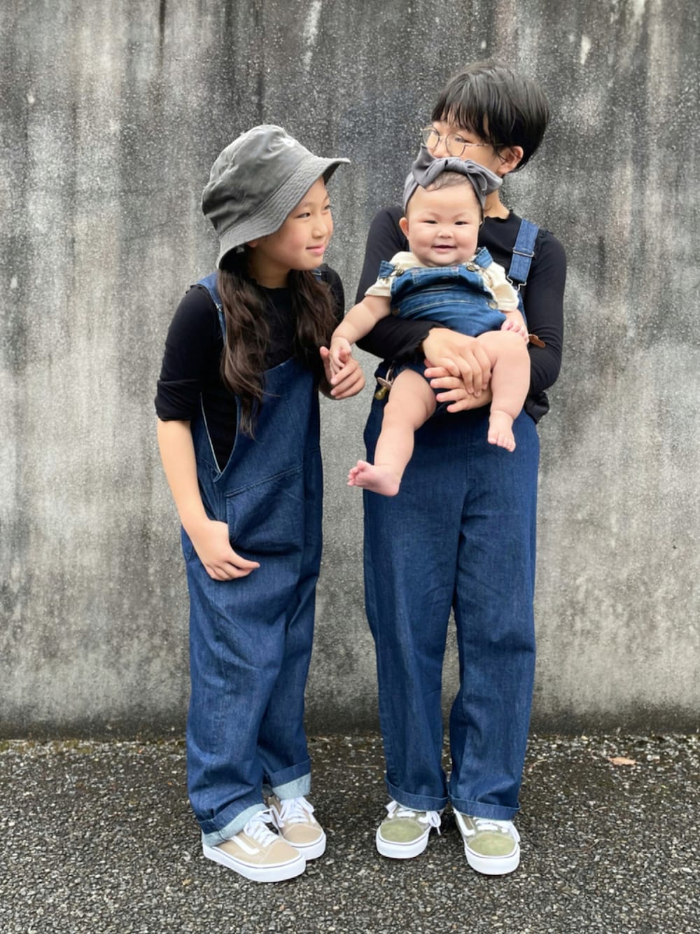 デニムサロペ♡一目惚れ。。 みんなでリンクしました♡ リブTのメロウ仕様が とっても可愛い♡ 最近雨続きで長袖が大活躍中🥺🙏 つなちゃんもヘアバンは 新作♡ (154cm/45kg) (135cm/31kg) 見ていただき ありがとうございます✨