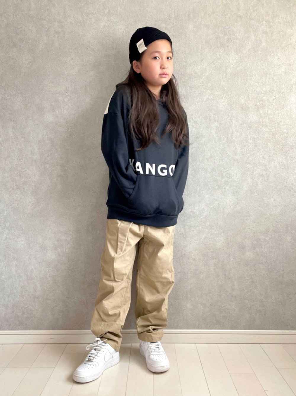 ストリート♪ カンゴールの 起毛切り替えプリントロゴプルパーカー 着用させていただきました♪ ゆったりシルエットと しっかりとしたフード 後ろの配色切り替え 全部のポイントがツボ♡ とにかく カッコいい♡ backとsideを小窓に♡ (135cm/31kg) 見ていただき ありがとうございます✨