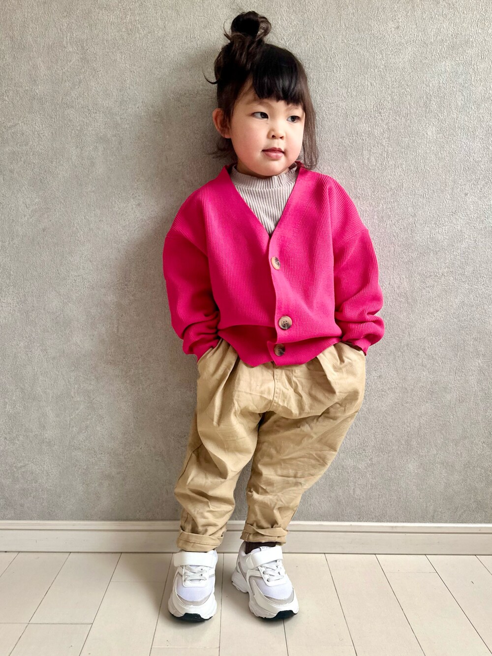 着回しコーデ♡ ピンクのカーディガンが お気に入りみたいです🩷 パンツの形も ほんとに可愛い😭! 春が楽しみ♡ 見ていただき ありがとうございます✨ (92cm/13kg) #PR