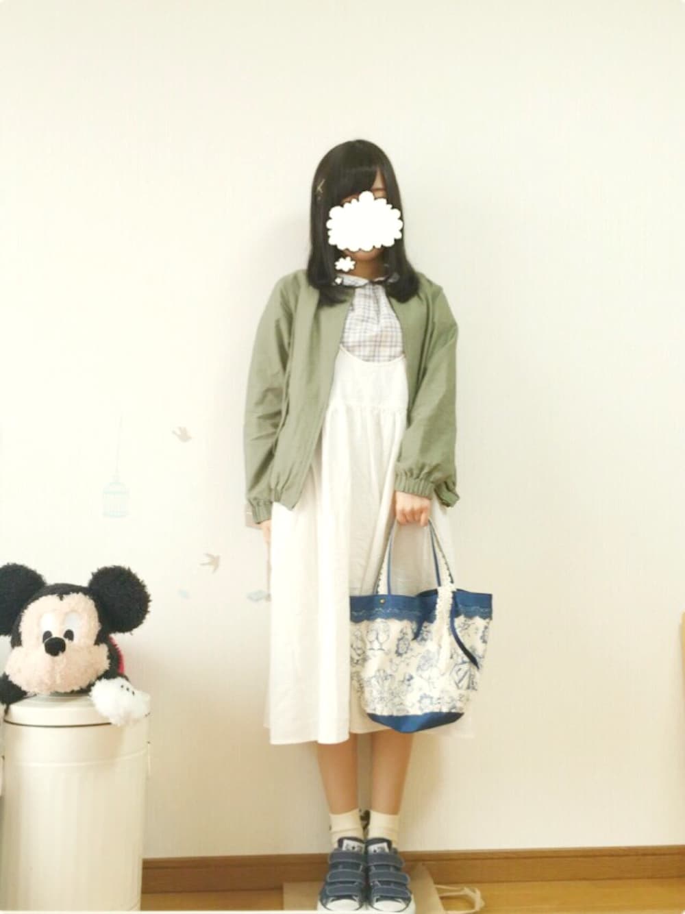 今日は久しぶりに白いワンピース(⁇)を引っ張り出して、コーデを組んでみました(^^)♩ ソックスにはカーキのリボンが付いていて、ブルゾンの色と合わせて統一感を出してみました🤔☘ ハンドバッグは、アリスでとってもお気に入りです♥️ 最近辞書を持ち歩くので、ハンドバッグが大活躍しています(^_^)☆
