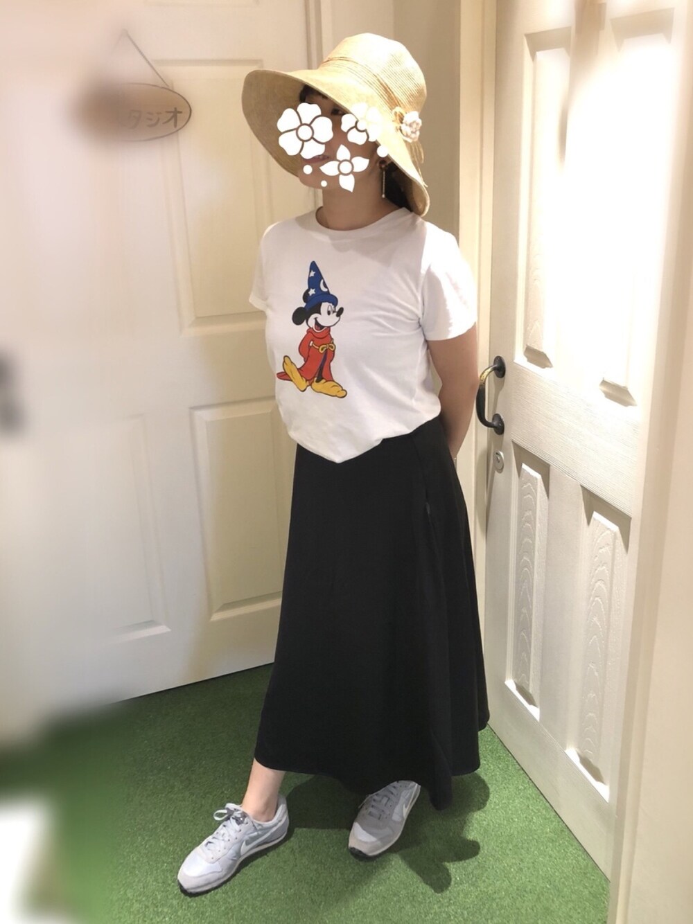 トップス 500円 スカート 590円 改めてビックリする安さ 二の腕がヤバイから見えない様に撮る笑 スカートはサテン地で お上品なでザイン! キャラクターTを着たいけど 若くなり過ぎない様に ボトムはエレガント風に NIKEのスニーカーは あまり汚したくないので 子供の用事が無い日に履きます