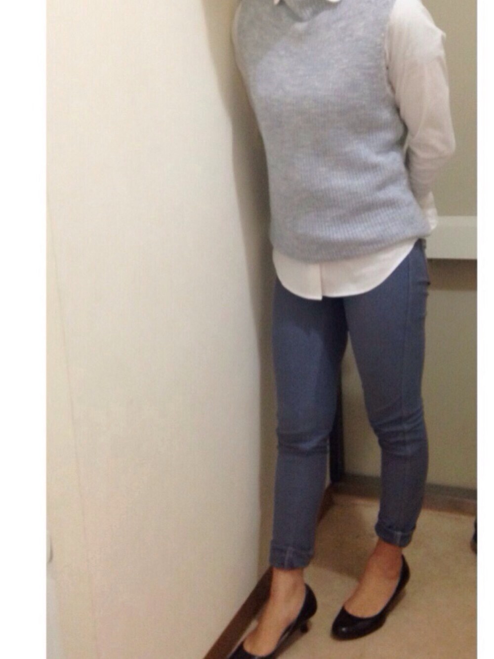 アイスブルーのニットベスト 本日しまむらで購入⭐️ コレ本当はロングなんだけど 裾を折ってジャストサイズで着ました! 私の体型だと この丈感が良いみたい 細身のパンツで合わせると スッキリ見える気がする(^^) 次回はちゃんと試着しなきゃ笑