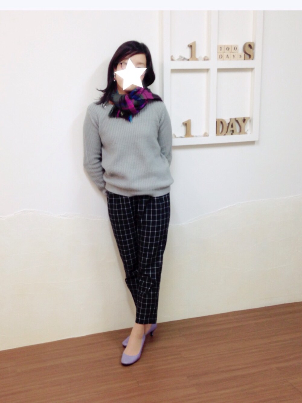 職場にて撮影しました(^^) シンプルになり過ぎない様に ストールを投入⭐️ このストールは 茶とパープルのバランスが 気に入っています パンプスもパープルに