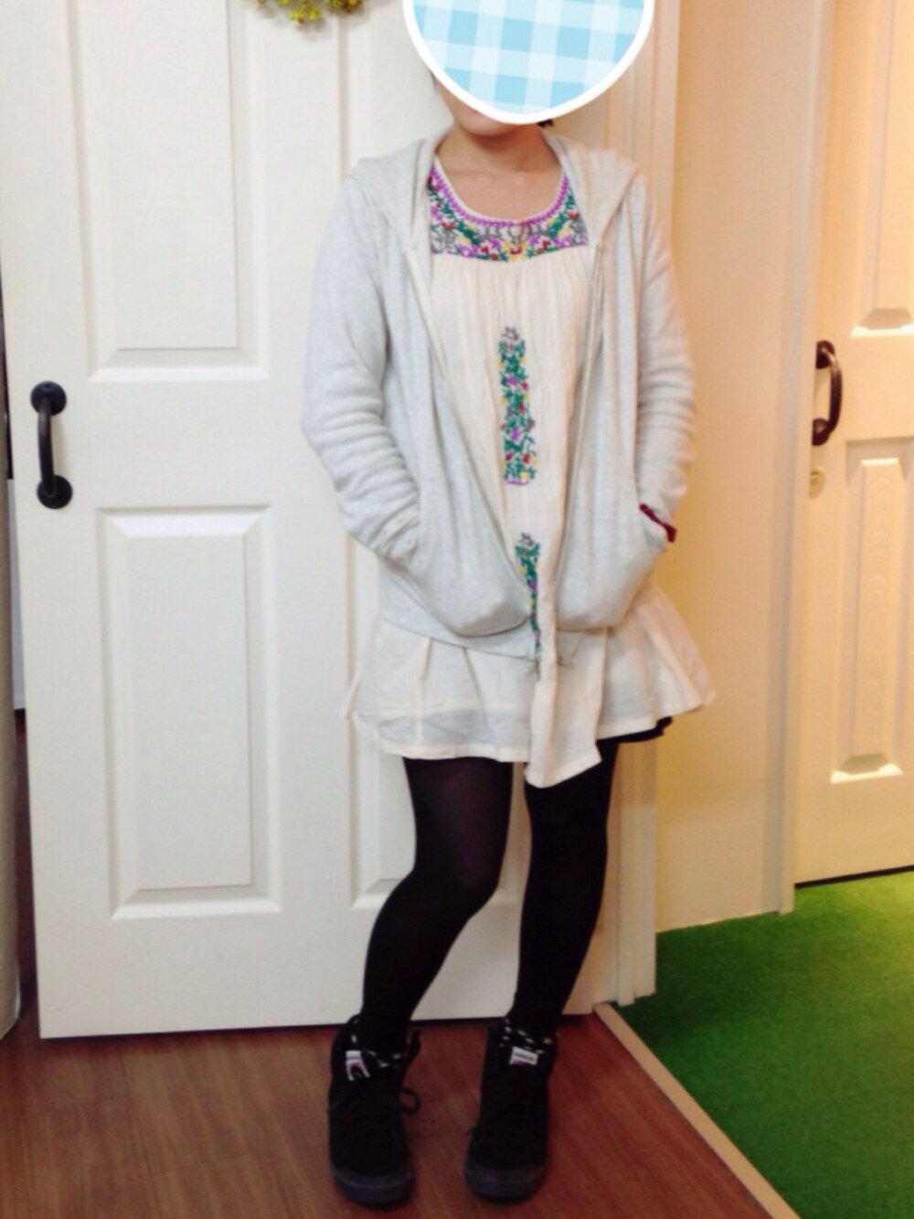 花柄のチュニック 刺繍がキレイで気に入っています 今日は職場で 赤ちゃんとママが集まる イベントだったので 抱っこ仕様に コットン素材のトップスにしました