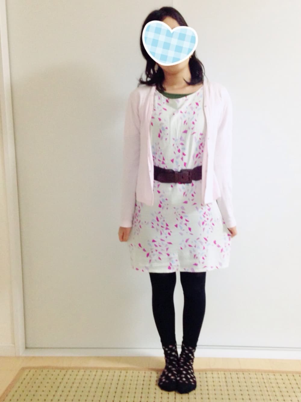 ピンクと白のワンピース ガーリーにしてみました⭐️ 足元は寒いのでタイツに ダイソーの厚手靴下を(^^) アクセントにベルトを使いました