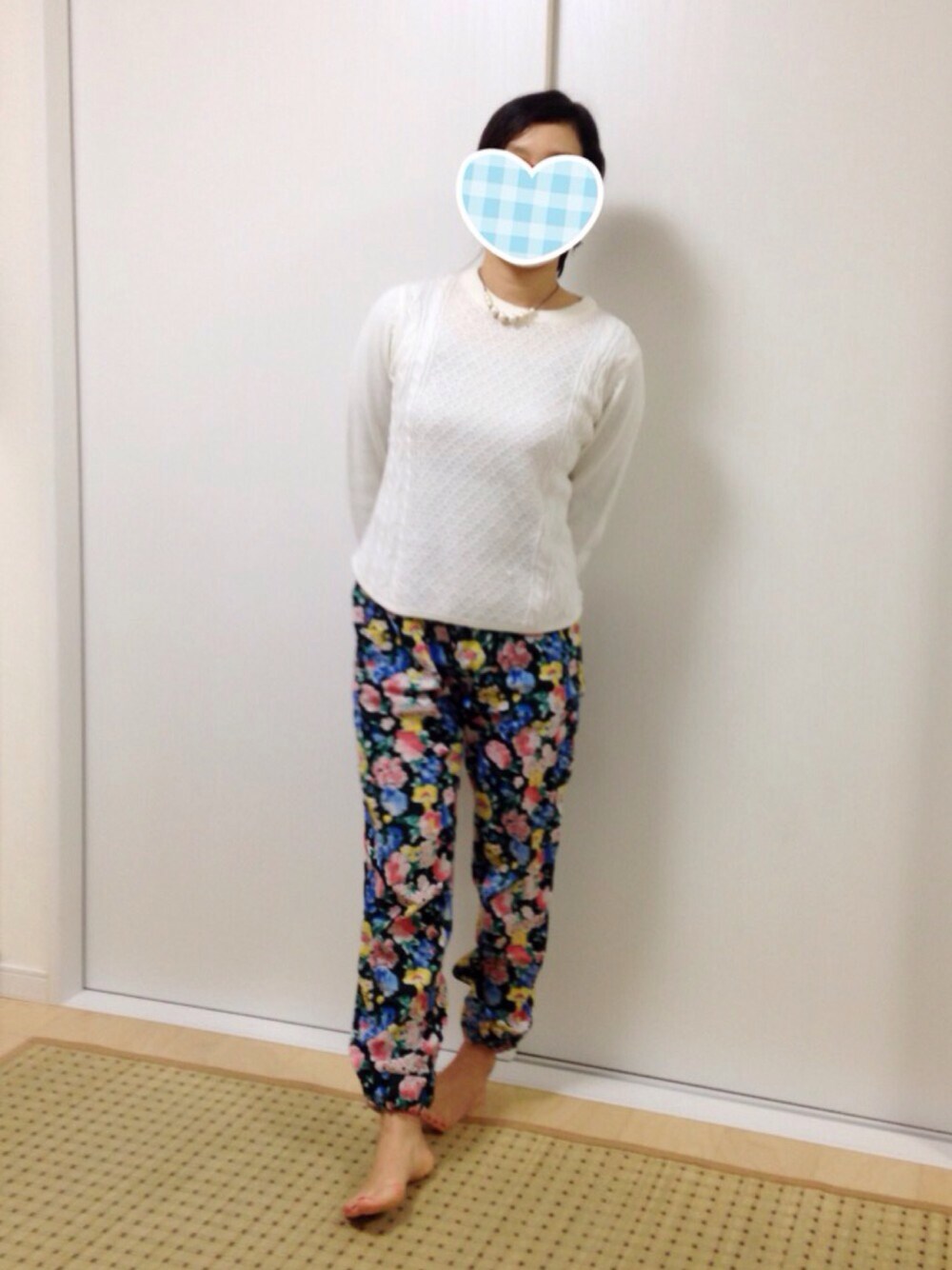 派手なパンツ ゆったりシルエットで 動きやすいです! トップスは白いニットで合わせました またもや素足ですが ちゃんとパンプスを履いて 仕事にいきましたよ!