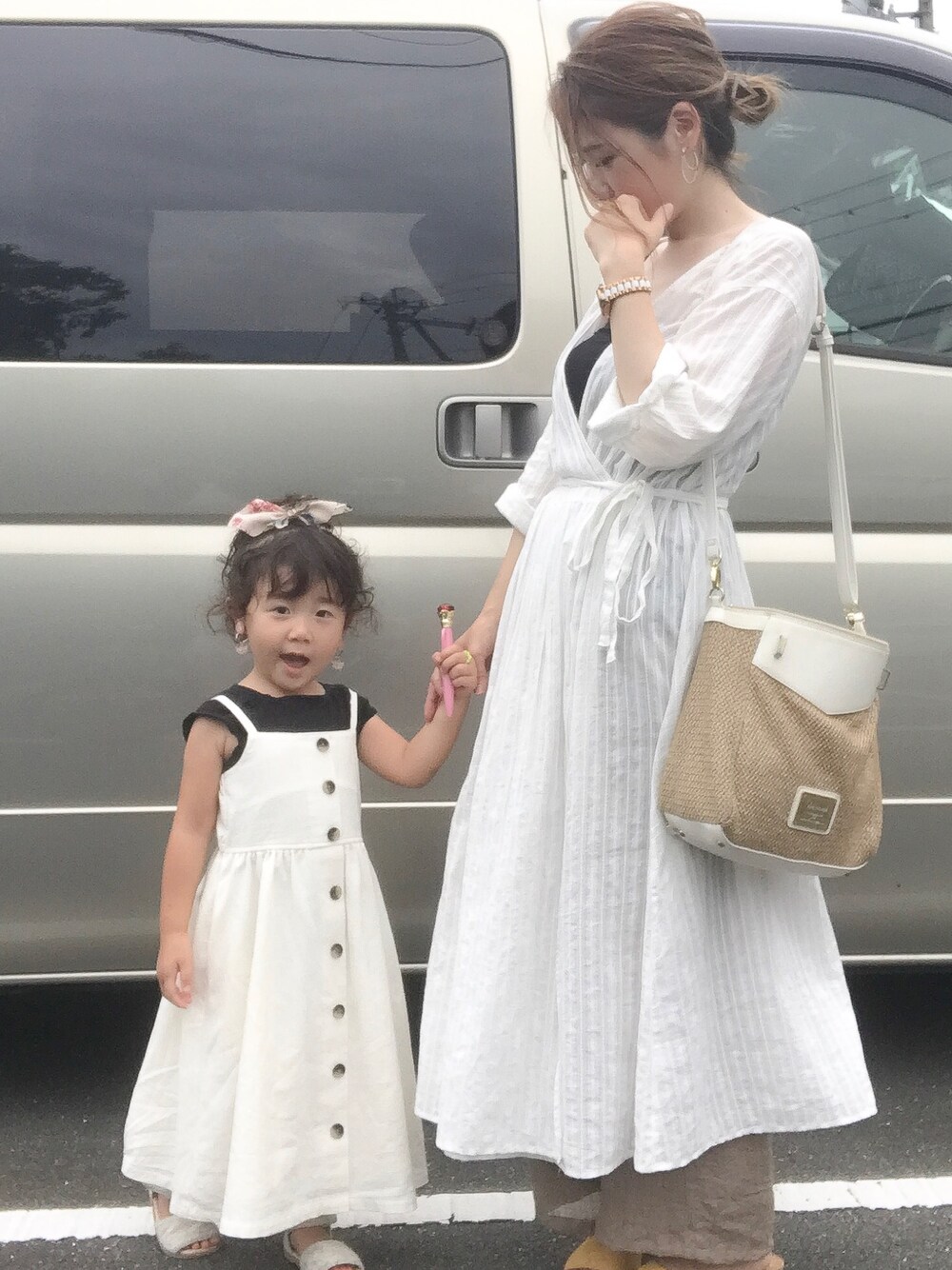 親子リンクコーデ💓 GUのホワイトワンピースで💓 ちょっとそこまでお買い物💓